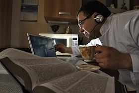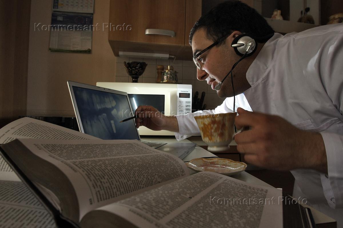 Врач-стоматолог Армен Лабикян во время проведения медицинской онлайн-консультации на дому.