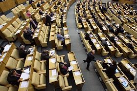 Депутат говорит по мобильному телефону на заседании Государственной думы России.