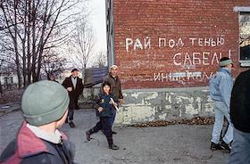 Ситуация в Чеченской Республики. Жанровая фотография. Надпись на стене жилого дома "Рай под тенью…