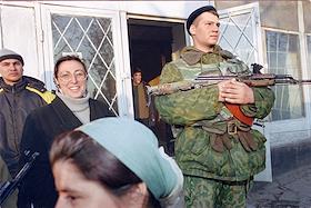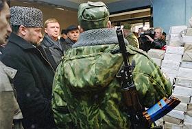 Ситуация в Чеченской Республики. Жанровая фотография. Военный патруль у здания первого гуманитарного…