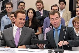 Президент России Дмитрий Медведев (слева) и губернатор штата Калифорния Арнольд Шварценеггер…
