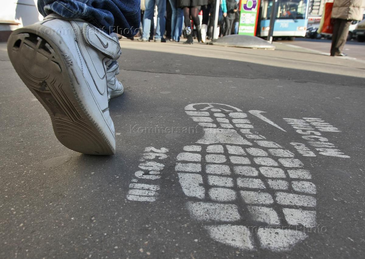 Реклама на асфальте. Сотрудники компании ООО "Новое время" размещают рекламу на асфальте.