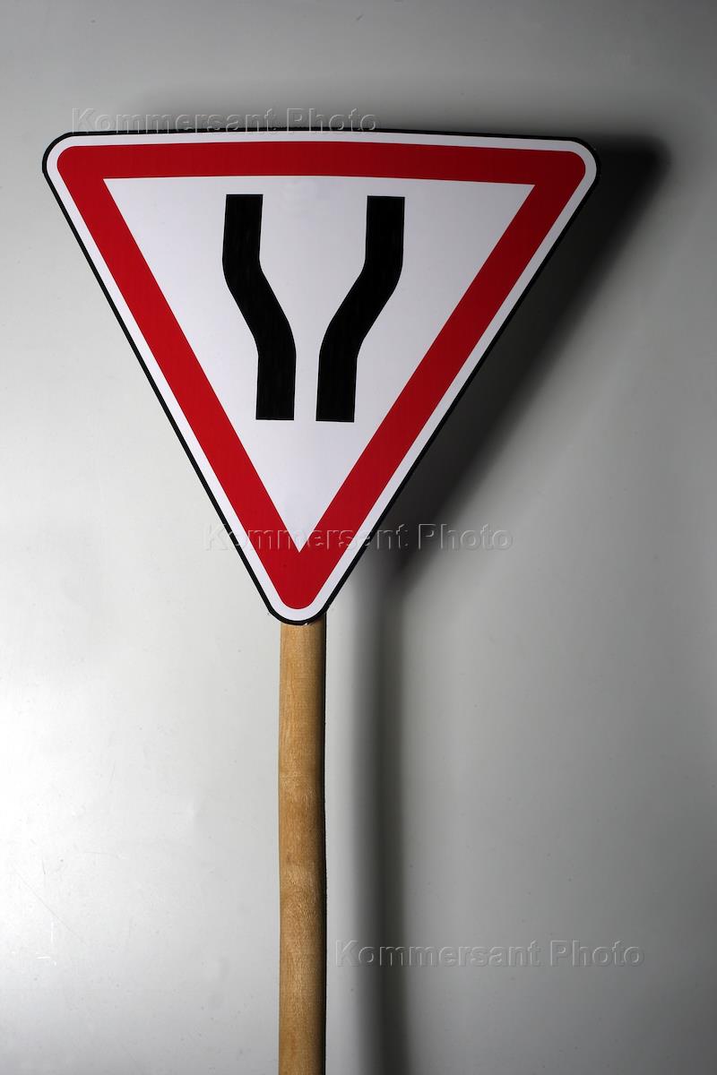 Обложка журнала "Деньги". Предупреждающий знак дорожного движения "сужение дороги с обеих сторон".