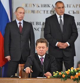 Слева направо: председатель правительства России Владимир Путин, глава РАО "Газпром" Алексей Миллер,…