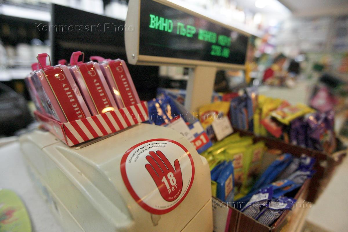 Жанровая фотография. Стикер "Мы не продаем алкоголь лицам недостигшим совершеннолетия" на кассовом…