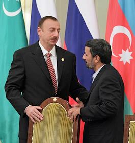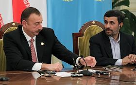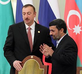 Президент Азербайджана Ильхам Алиев (слева) и президент Ирана Махмуд Ахмадинежад (справа) во время…