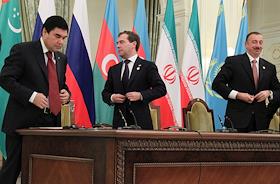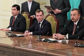 Слева направо: президент Туркмении Гурбангулы Бердымухамедов, президент России Дмитрий Медведев,…