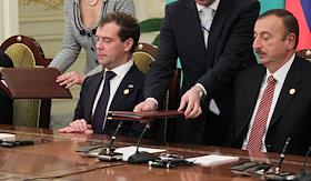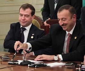 Президент России Дмитрий Медведев (слева) и президент Азербайджана Ильхам Алиев (справа) во время…