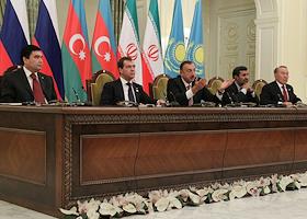 Слева направо: президент Туркмении Гурбангулы Бердымухамедов, президент России Дмитрий Медведев и…