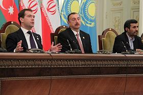 Слева направо: президент России Дмитрий Медведев, президент Азербайджана Ильхам Алиев и президент…