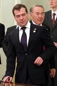 Президент России Дмитрий Медведев (слева) и президент Казахстана Нурсултан Назарбаев (справа) во…