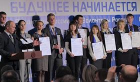 Председатель правительства России Владимир Путин (третий слева) на церемонии награждения победителей…