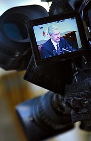 Мэр Москвы Сергей Собянин (на экране) во время встречи с членими Российского союза промышленников и…