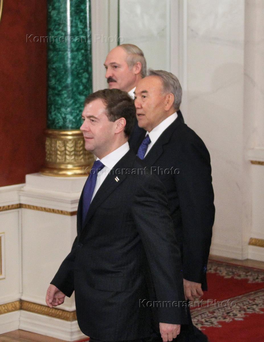 Слева направо: президент России Дмитрий Медведев, президент Казахстана Нурсултан Назарбаев,…