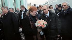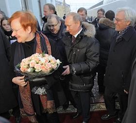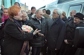 Председатель правительства России Владимир Путин (в центре) встретил на вокзале Выборга президента…