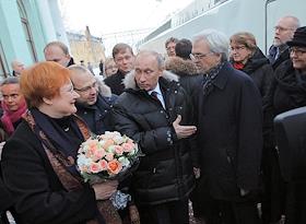 Председатель правительства России Владимир Путин (второй справа) встретил на вокзале Выборга…