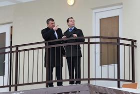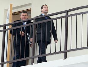 Президент России Дмитрий Медведев (слева) и губернатор Московской области Борис Громов (справа) во…