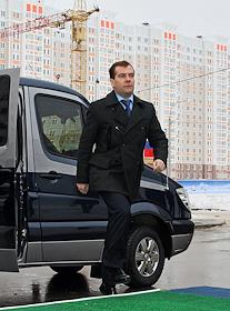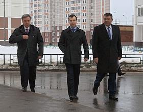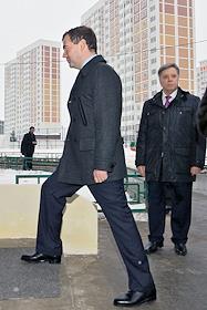 Президент РФ Дмитрий Медведев во время осмотра жилья для военнослужащих в микрорайоне "Кузнечики" в Подольске.