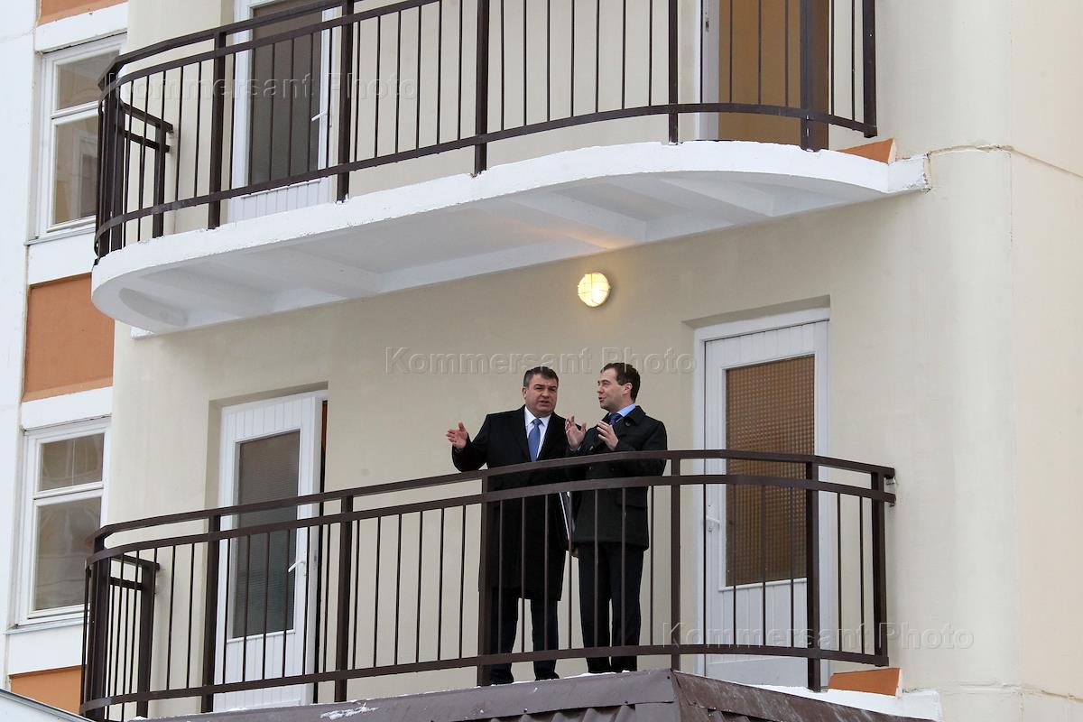Министр обороны России Анатолий Сердюков во время осмотра президентом России строящегося жилья для…