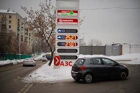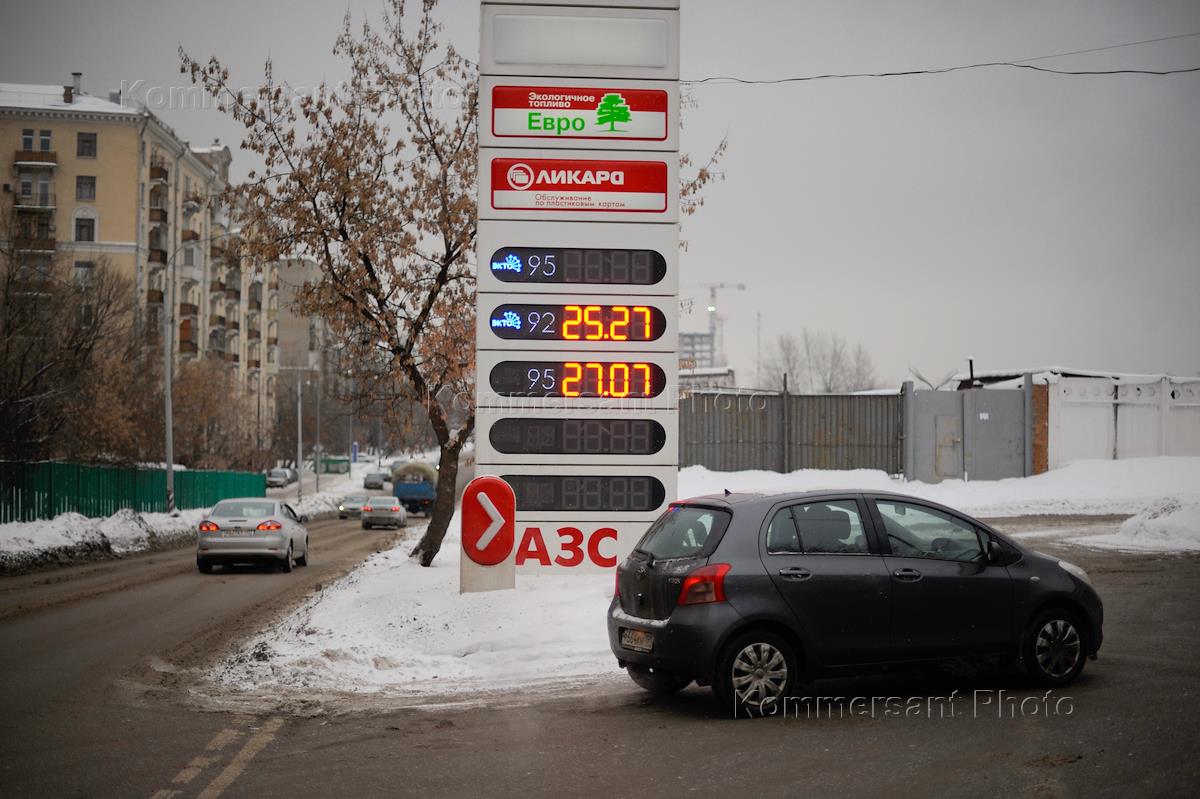 Жанровая фотография. Рекламный стенд компании "Лукойл" на автозаправке с указанием цен на марки…