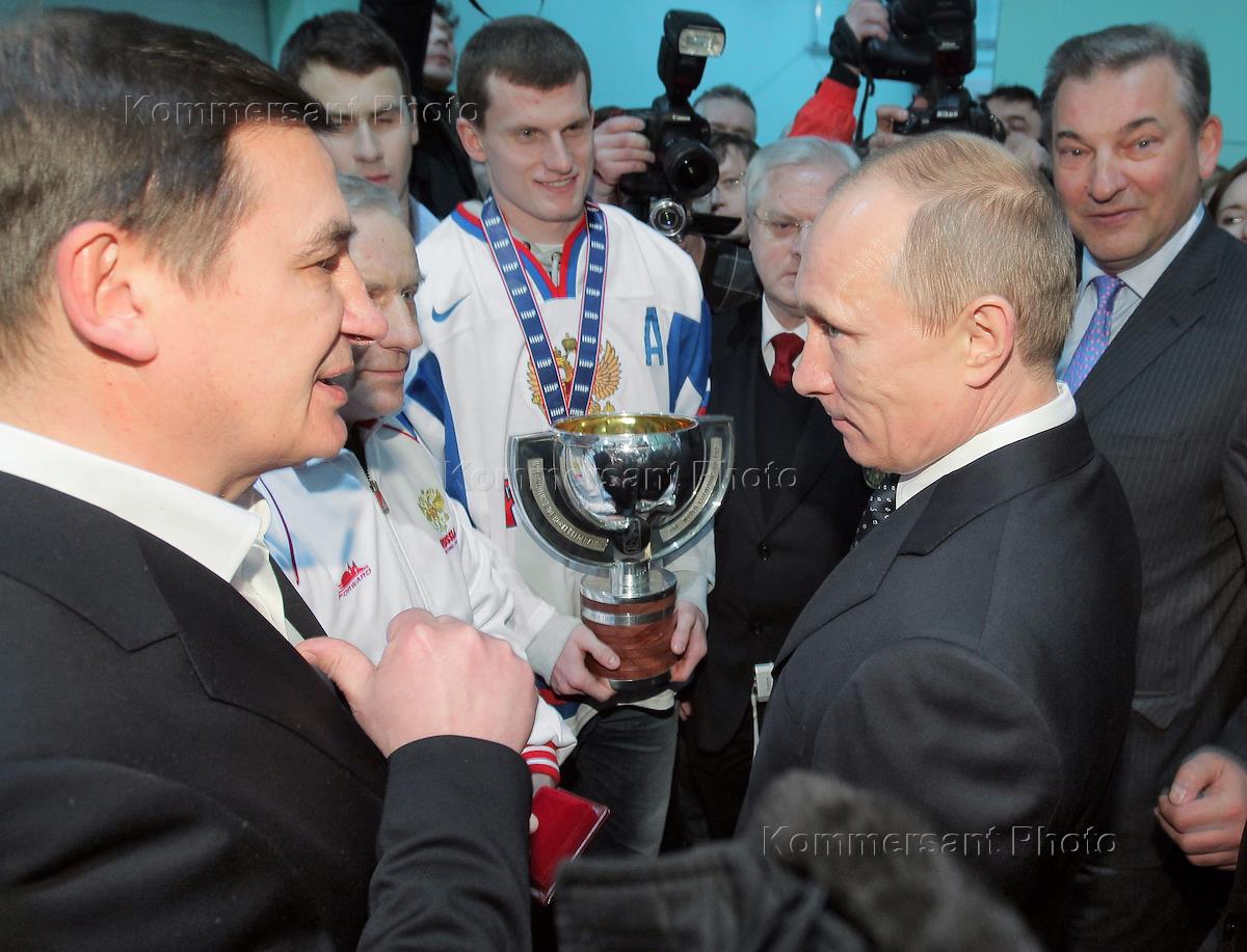 Главный тренер молодежной сборной России по хоккею Валерий Брагин (второй слева), председатель…