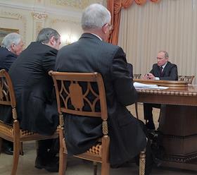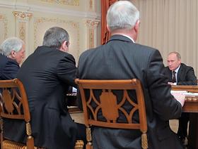 Председатель правительства России Владимир Путин (справа) во время встречи с руководством партии…