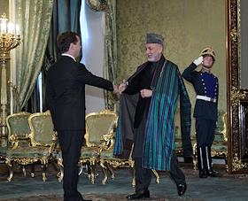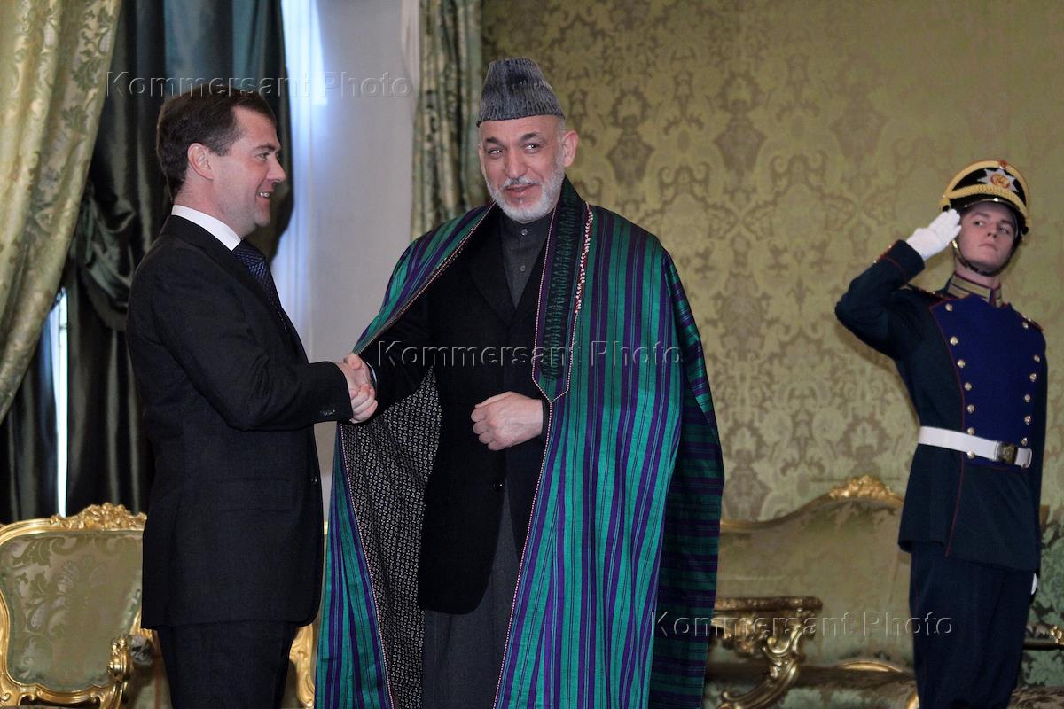 Президент Афганистана Хамид Карзай (слева) и президент России Дмитрий Медведев (справа) во время…