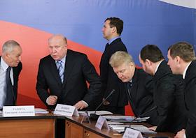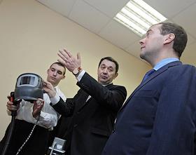 Президент России Дмитрий Медведев (справа) во время посещения предприятия ОАО "Арзамасское…
