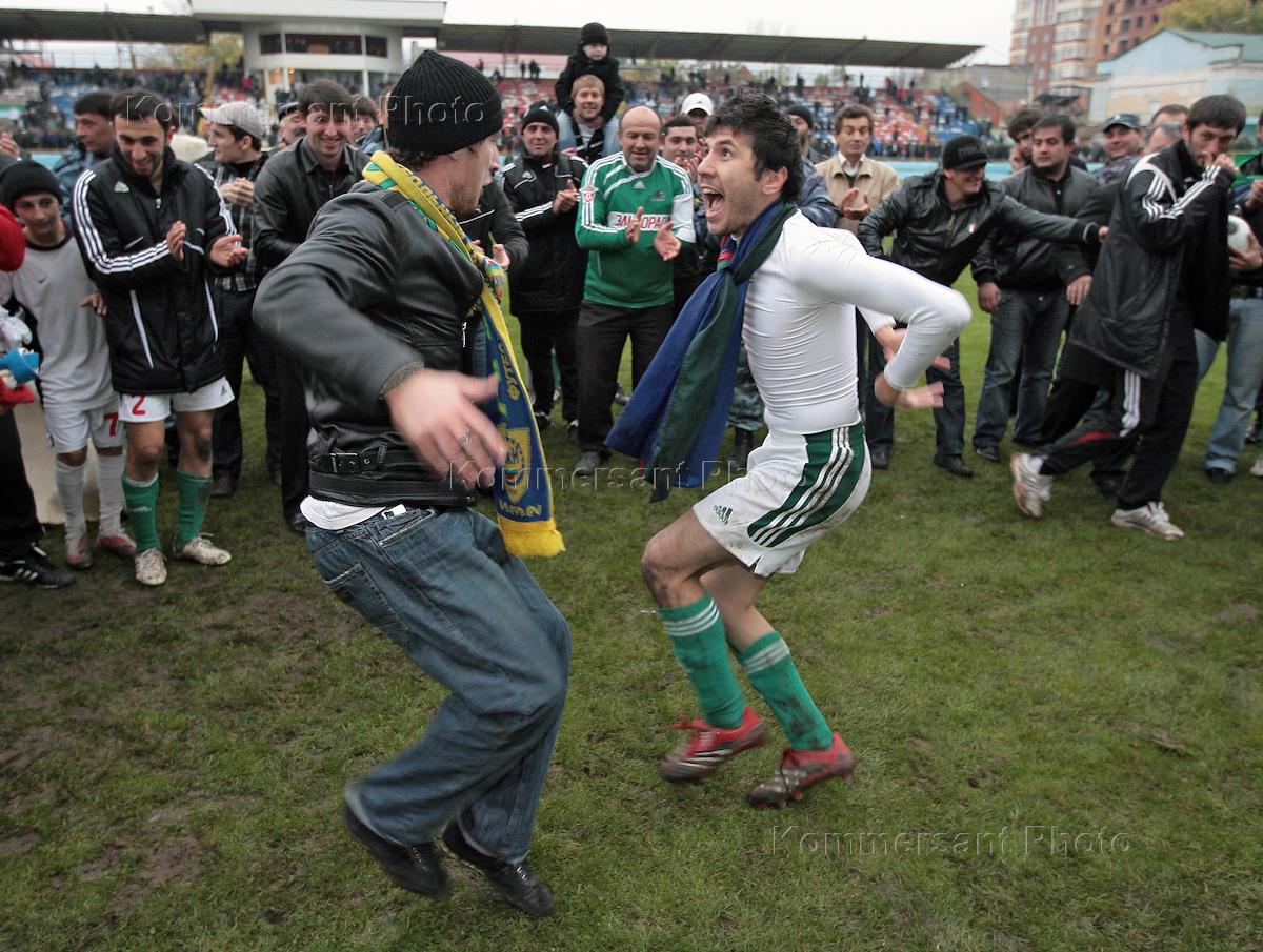 Болельщики и футболисты празднуют победу команды "Анжи" (Махачкала) в матче на стадионе "Динамо".
