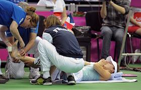 Французская теннисистка Ализе Корне получает медицинскую помощь во время матча чемпионата мира по…