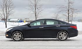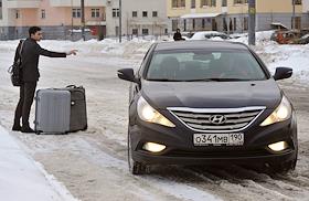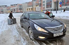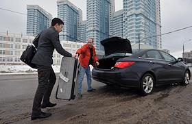 Тест-драйв автомобиля Hyundai Sonata. Пассажир с багажом останавливает машину.