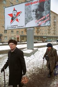Пенсионеры на фоне предвыборного агитационного щита "Сталинского Блока за СССР".