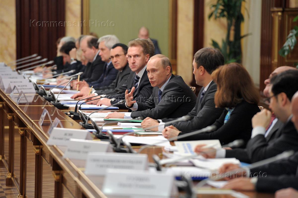 Председатель правительства России Владимир Путин (в центре) во время встречи с руководителями…
