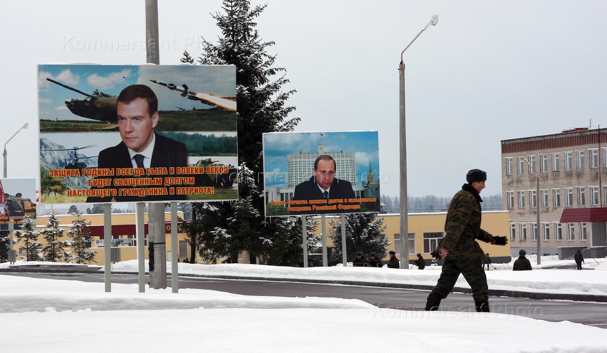 Кантемировская танковая дивизия в Наро-Фоминске. Плакаты с портретами президента России Владимира…
