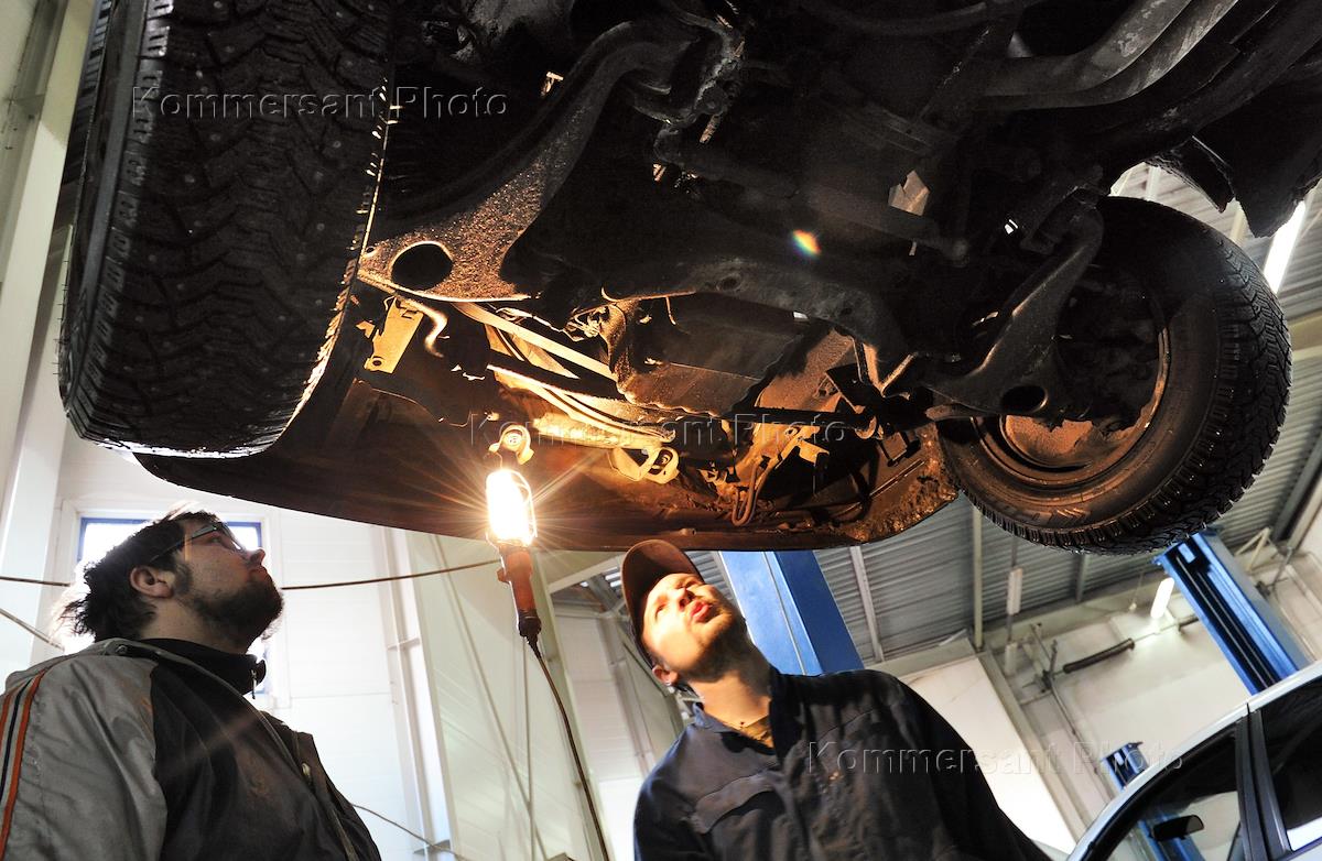 Работа московского авторынка "Формула 91. Суперавтомаркет". Автомеханик осматривает машину.