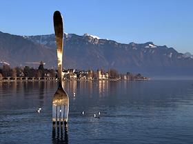 Виды города Веве (Vevey). Гигантская вилка - памятный знак в честь 10-летия Музея еды - Alimentarium…