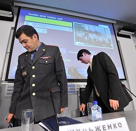 Видеомост Москва-Санкт-Петербург на тему: "Банковские карты в руках инспекторов ГИБДД", в новом зале пресс-центра РИА "Новости".
