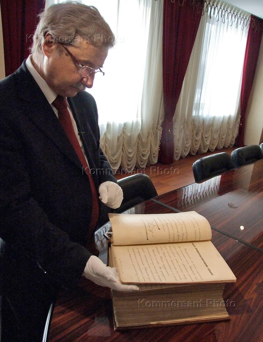 Российский государственный исторический архив. Директор архива Александр Соколов деомнстрирует сборник императорских указов.