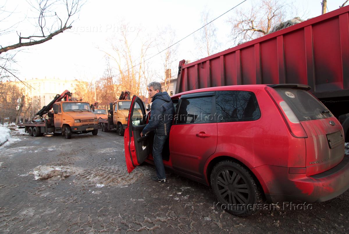 Уборка снега на улице Врубеля возле здания ИД "Коммерсантъ".