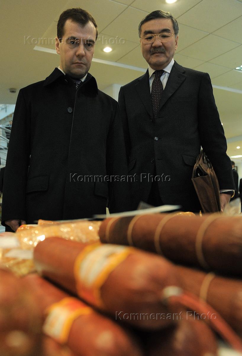 Президент России Дмитрий Медведев (справа) во время посещения выставки товаров, производимых…