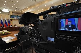 Президент России Дмитрий Медведев (на экране) на совещании по вопросам государственной политики в…