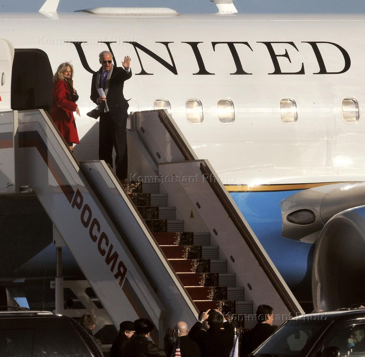 Вице-президент Соединенных Штатов Америки (США) Джозеф Байден (справа) в аэропорту "Внуково-3" перед…