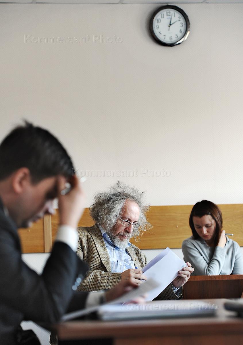 Главный редактор радиостанции "Эхо Москвы" Алексей Венедиктов (в центре) во время рассмотрения иска…