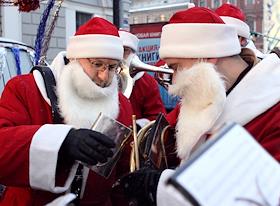 Музыканты духового оркестра в костюмах Дедов Морозов на церемонии открытия Петербургской…