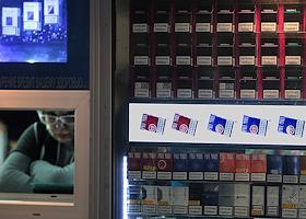 Жанровая фотография. Продажа табачных изделий на улицах города. Пачки сигарет в витрине табачного…