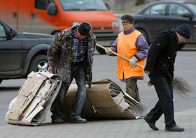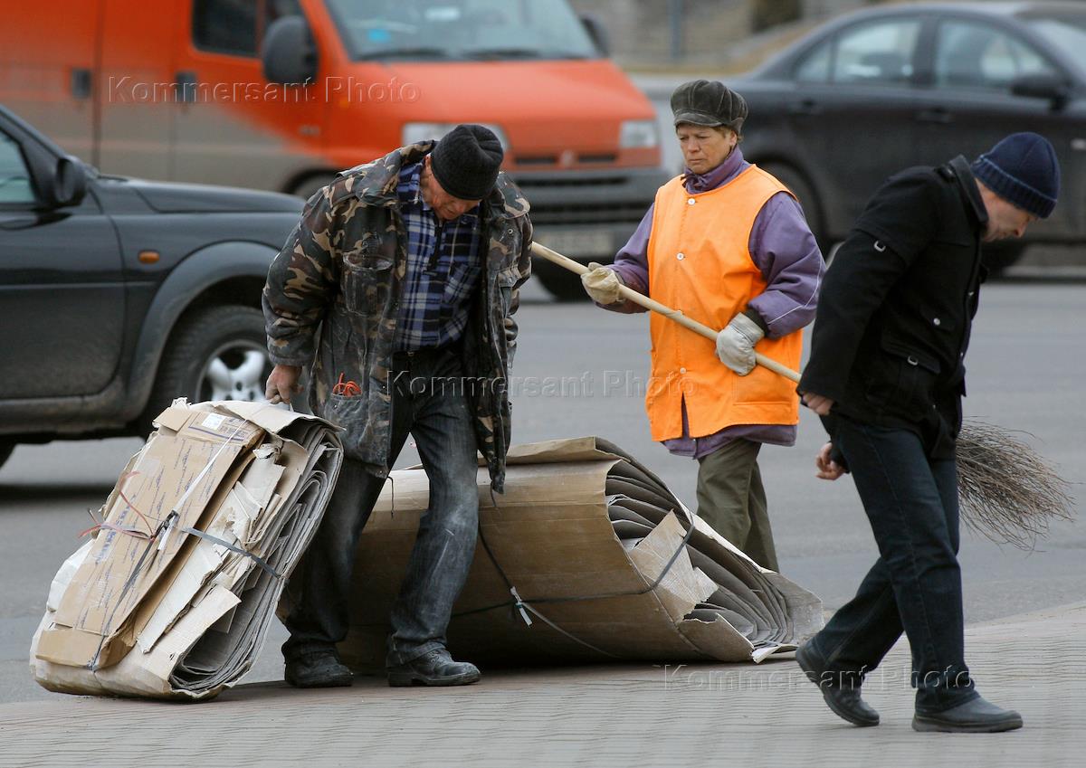 Жанровая фотография. Мужчина несет связки макулатуры.