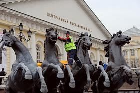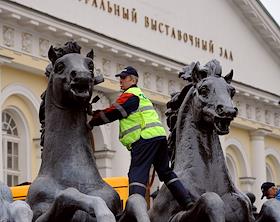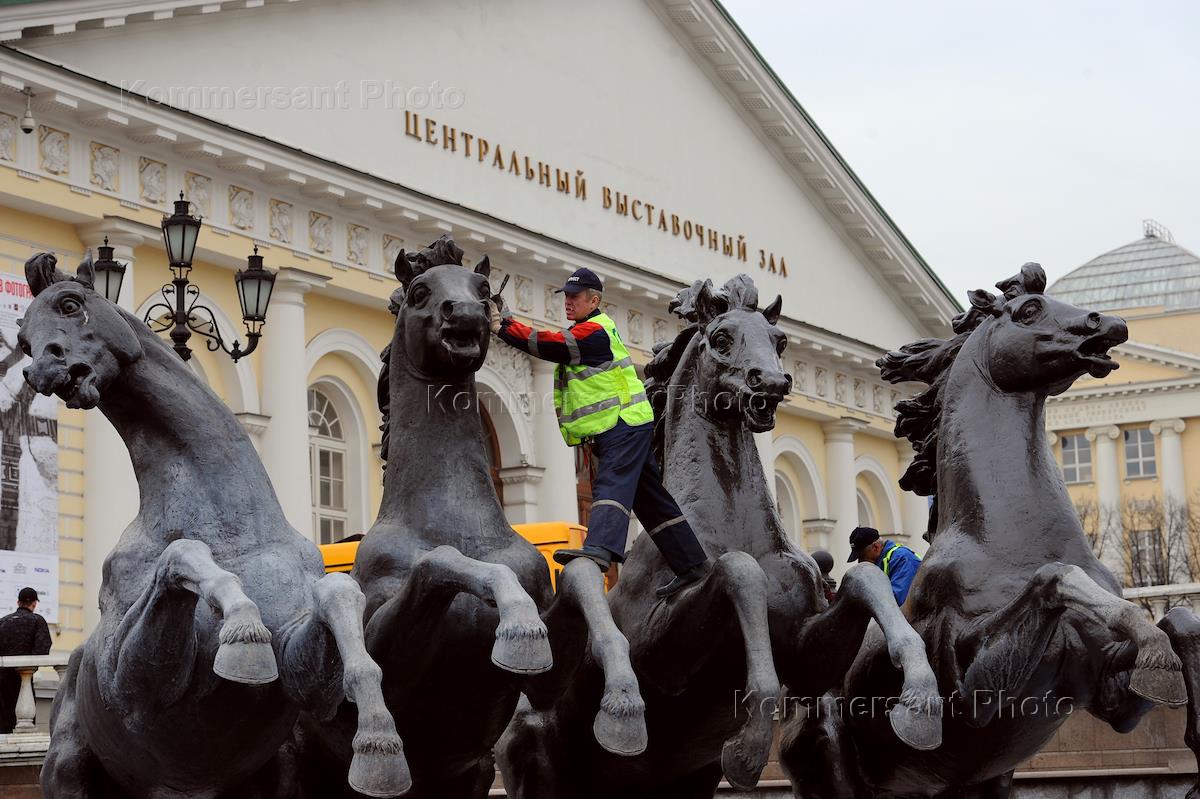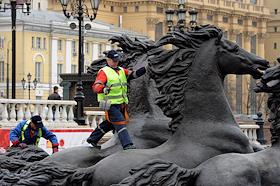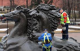 Жанровая фотография. Работники коммунальных служб во время покраски скульптурной группы "Времена…