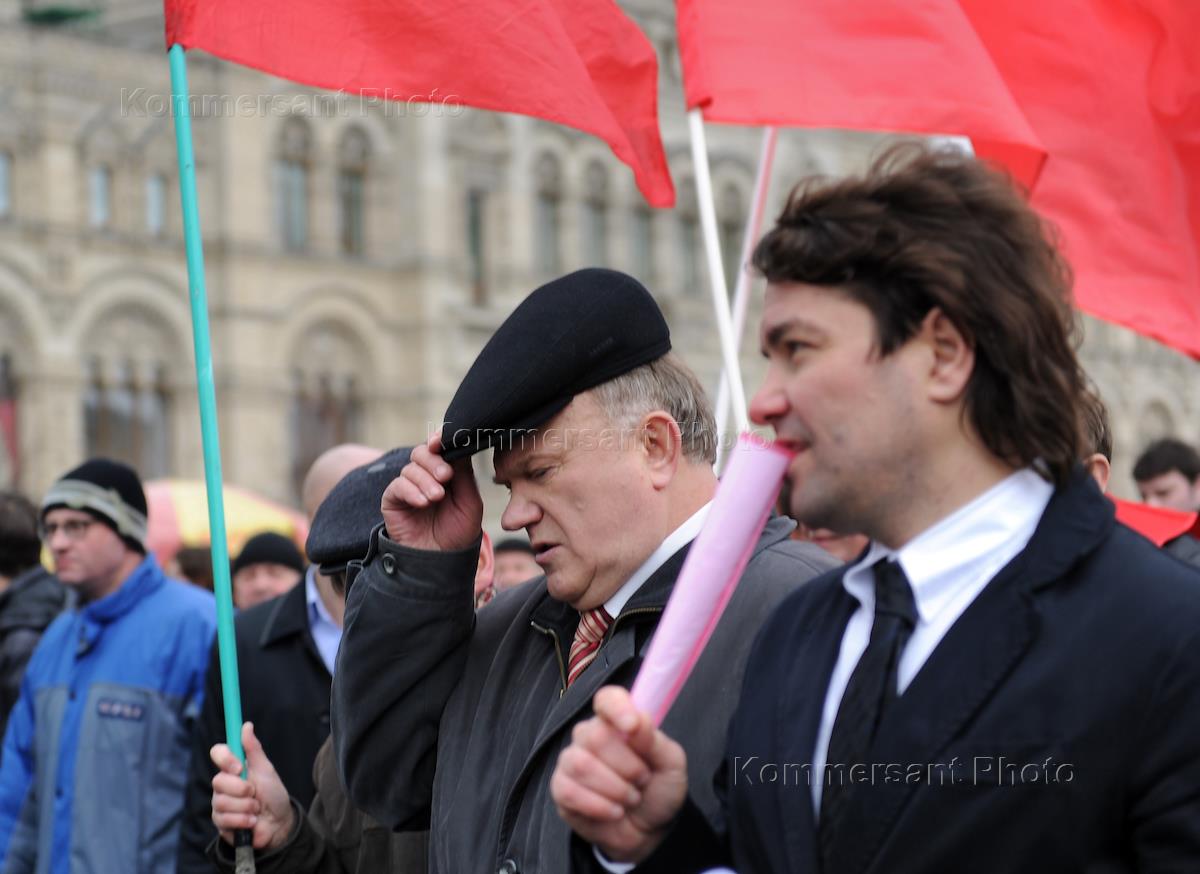 Лидер Коммунистической партии России (КПРФ) Геннадий Зюганов (слева) и пресс-секретарь Геннадия…