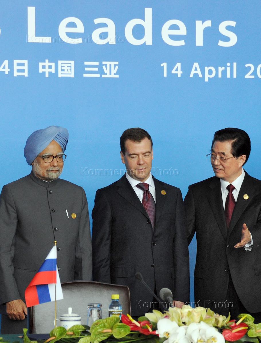 Слева направо: премьер-министр Индии Манмохан Сингх, президент России Дмитрий Медведев, председатель…