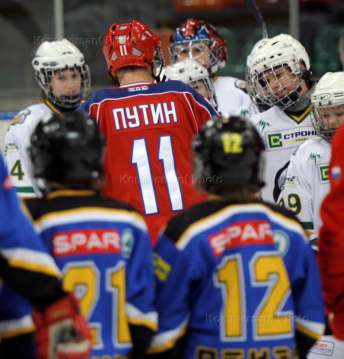 Председатель правительства России Владимир Путин (в центре) на тренировке финалистов хоккейного…